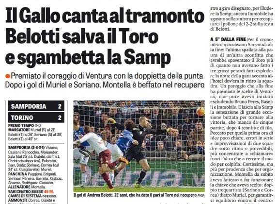 Gazzetta dello Sport, ex rosa: “Il Gallo canta al tramonto. Belotti salva il Toro e sgambetta la Samp”