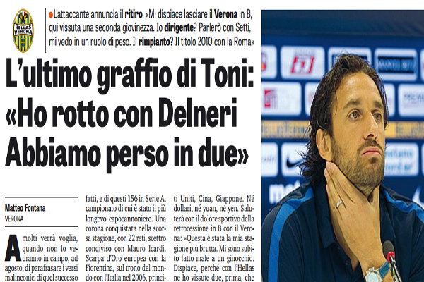 Gazzetta dello Sport: “Ex rosa, l’ultimo graffio di Toni: «Ho rotto con Delneri, abbiamo perso in due»”