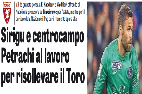 Gazzetta dello Sport: “Ex rosa Sirigu e centrocampo, Petrachi al lavoro per risollevare il Toro”