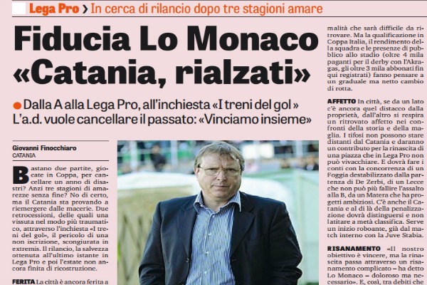 Gazzetta dello Sport: “Fiducia Lo Monaco: «Catania, rialzati». L’a.d. vuole cancellare il passato: «Vinciamo insieme»”