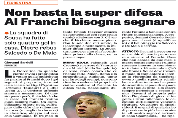 “La Fiorentina da qualche giorno invita i propri tifosi a votare quale musichetta far partire al Franchi dopo i gol segnati. A proposito, è ormai testa a testa fra Gigi D’Agostino (L’Amour Toujours) e i Blur (Song 2), il verdetto ufficiale stasera a mezzanotte. Di questo passo però, il rischio è che le casse del Franchi restino quasi sempre mute. Un destabilizzante effetto noia, suffragato dalle cifre che rallentano la corsa (o meglio la rincorsa) in classifica, aleggia sul vecchio Comunale. In tre mesi di campionato, in casa, la squadra di Paulo Sousa ha trovato la via del gol appena quattro volte. Peggio hanno fatto soltanto Empoli (peggior attacco del campionato con sette reti in totale) e Palermo con 3. C’è anche il bicchiere mezzo pieno. Con le sole due reti subite, la Fiorentina è nettamente la miglior difesa interna. La Juventus, tanto per citare la favoritissima prima della classe, ne ha prese cinque MURO VIOLA Falcinelli (del Crotone) su errore di Tatarusanu e Muriel (della Sampdoria) di testa. Sono coloro che ce l’hanno fatta. Milan, Roma e la straordinaria Atalanta, tanto per fare degli esempi, non sono riuscite a vedere dei propri calciatori esultare al Franchi. La difesa viola, barcollante durante l’ultima a San Siro contro l’Inter, in sostanza tiene. A proposito, domani Gonzalo Rodriguez non ci sarà (è squalificato) e il ballottaggio tra Salcedo e De Maio è serrato. ATTACCO Davanti invece serve un cambio di marcia per tornare a vincere al Franchi. Cosa che non accade da due mesi e mezzo considerato che l’ultimo successo interno in campionato è datato 18 settembre (10 alla Roma). Sousa deve trovare il modo di trapiantare a Firenze la Fiorentina da trasferta: ovvero quella squadra scintillante e divertente anche quando sconfitta, capace di segnare 16 reti (più di tutte) e di essere sempre pericolosa e spesso cinica. Davanti al proprio pubblico l’impianto di gioco si ingolfa, i ritmi rallentano, le occasioni difficilmente vengono sfruttate. Questione di spazi: ridotti. E magari di quel pizzico di pressione in più che non aiuta. «Il nostro sogno è arrivare in zona Champions» – ha ripetuto ieri Chiesa a Salotto Viola, su Sportitalia. Servono risultati che alimentino tutto ciò”. Questo quanto si legge su “La Gazzetta dello Sport”.