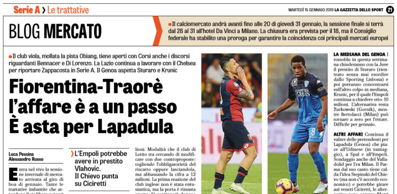 Gazzetta dello Sport: “Fiorentina-Traorè, l’affare è a un passo. È asta per Lapadula. Tutte le trattative del giorno in serie A”