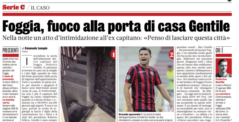 L’edizione odierna della “Gazzetta dello Sport” si sofferma sull’intimidazione subita da Federico Gentile, ex capitano del Foggia.