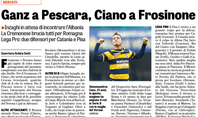 “Frosinone e Pescara fanno già capire di voler essere protagonisti del prossimo campionato con due rinforzi di alto livello.Per il Frosinone c’è Ciano, che verrà acquistato dal Cesena bruciando qualche club di A che lo voleva. Per il Pescara invece è fatta con Ganz, l’attaccante del Verona rientrato alla Juve e corteggiato da molti club di B; potrebbe seguirlo Cappelluzzo, sempre del Verona e già in Abruzzo.