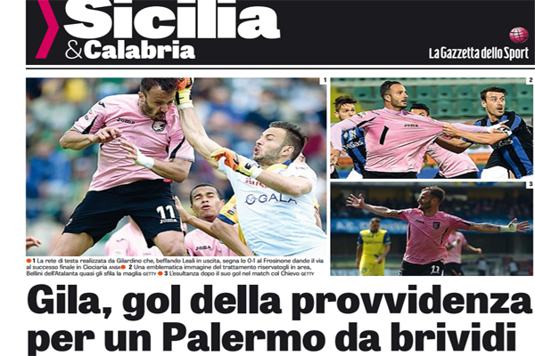 Gazzetta dello Sport: “Gila, gol della provvidenza per un Palermo da brividi. Nove i centri in rosanero nonostante qualche panchina di troppo. Ora vuole i gol salvezza per zittire Zamparini”