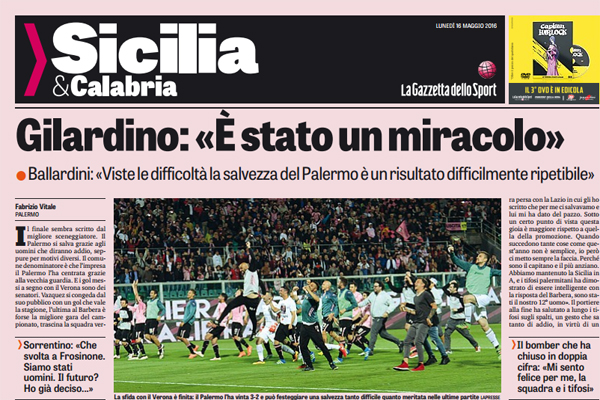 “Il finale sembra scritto dal migliore sceneggiatore. Il Palermo si salva grazie agli uomini che diranno addio, seppure per motivi diversi. Il comune denominatore è che l’impresa il Palermo l’ha centrata grazie alla vecchia guardia. E i gol messi a segno con il Verona sono dei senatori. Vazquez si congeda dal suo pubblico con un gol che vale la stagione, l’ultima al Barbera è forse la migliore gara del campionato, trascina la squadra vero la salvezza, lottando, disegnando traiettorie, ma soprattutto trovando il numero dal limite col quale buca il Verona facendo sballare i piani di sorpasso del Carpi. «Questo per me è un capolavoro – dice il tecnico Ballardini –. Considerato quello che è successo durante questa stagione è un risultato che difficilmente si può ripetere». BATTAGLIA È stata una notte di battaglia nella quale i vecchietti terribili e per molto tempo osteggiati dal presidente Zamparini sono saliti al potere, perché oltre al Mudo c’è anche Sorrentino. Il portiere ha salvato due volte con deviazioni che hanno guidato le conclusioni di veronesi sul palo. Sono loro i protagonisti con Maresca, suo il 21, e Gilardino, che firma il terzo gol, il decimo stagionale e il 188 in A che gli vale l’aggancio a Signori e Del Piero: «Dopo una stagione non facile – dice il bomber –, siamo riusciti a compiere un miracolo sportivo bellissimo. Sono felice per me per i miei compagni e per i tifosi». Il Verona non ha concesso nulla. GRAZIE DELLE CRITICHE Ma alla fine sono prevalse le motivazioni di chi voleva centrare l’obiettivo. «Ringrazio tutti quelli che hanno buttato merda sul Palermo, tra direttori sportivi, calciatori, giornalisti e opinionisti, perché alla fine ci hanno dato la forza per centrare la salvezza – dice Sorrentino –. Noi tutti tenevamo a salvarci, perché quando alle 4 del mattino ti ritrovi con tutti compagni online sui telefonini per confrontarci su quello che dovevamo fare, significa che siamo stati una grande squadra. La svolta? Col Frosinone abbiamo dimostrato di essere uomini con le palle. Ma io sono stato sempre positivo. Ho mandato un messaggio a un importante uomo di calcio dopo la gara persa con la Lazio in cui gli ho scritto che per me ci salvavamo e lui mi ha dato del pazzo. Sotto un certo punto di vista questa gioia è maggiore rispetto a quella della promozione. Quando succedono tante cose come quest’anno non è semplice, io però ci metto sempre la faccia. Perché sono il capitano e il più anziano. Abbiamo mantenuto la Sicilia in A, e i tifosi palermitani ha dimostrato di essere intelligente con la risposta del Barbera, sono stati il nostro 12° uomo». Il portiere alla fine ha salutato a lungo i tifosi sugli spalti, un gesto che sa tanto di addio, in virtù di un contratto che non verrà rinnovato. «Sapevamo che vincendo eravamo salvi – conclude Sorrentino –. Anche oggi (ieri, ndr) come in tutta la stagione ci siamo complicati la vita, l’importante però sono i tre punti. Ho salutato la gente che è venuta allo stadio, nei prossimi giorni dirò cosa ho deciso. Ho già preso la mia decisione, ma devo aspettare un attimo per parlare col grande capo»”. Questo quanto si legge sull’edizione odierna de “La Gazzetta dello Sport”.