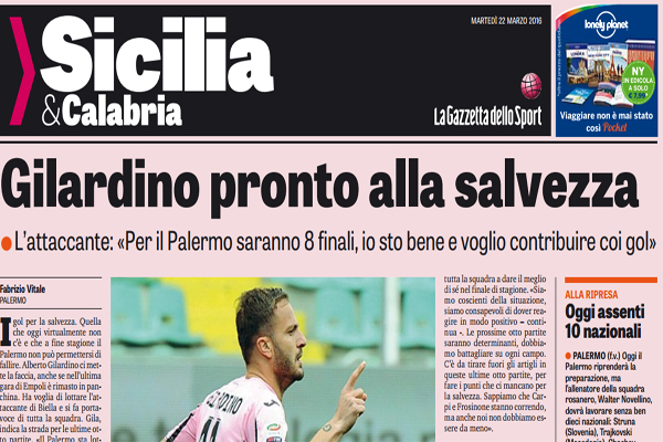 Gazzetta dello Sport: “Gilardino pronto alla salvezza: «Per il Palermo saranno 8 finali, io sto bene e voglio contribuire coi gol»”