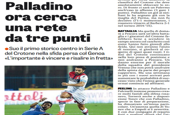 ANCORA IN ESILIO Domani si tornerà all’Adriatico Cornacchia di Pescara che ha visto il Crotone esordire ‘in casa’ contro il Genoa e portarsi in vantaggio proprio con un gol dell’ex attaccante di Parma e Juve. Gol inutile vista la veemente rimonta della squadra di Juric nel secondo tempo. Ma un gol in serie A è importante anche quando si perde, specie se in quella gara colpisci pure una clamorosa traversa: vai in credito con la fortuna. Così come lo è per la gara di Empoli dove nel secondo tempo è andato ad un passo dal gol del 21. Ma adesso servono i gol pesanti, quelli che devono per forza smuovere la classifica del Crotone che deve assolutamente sbloccare lo zero. Di fronte ci sarà un Palermo anch’esso in affanno (3 gare 1 punto). Palladino un gol ai siciliani lo ha segnato già con la maglia del Parma, ma non fu decisivo (l’11 momentaneo, i rosanero vinsero al Barbera 21 nel torneo 2014/15).