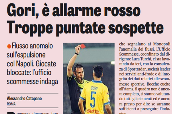 Gazzetta dello Sport: “Gori, è allarme rosso. Troppe puntate sospette, flusso anomalo sull’espulsione col Napoli”