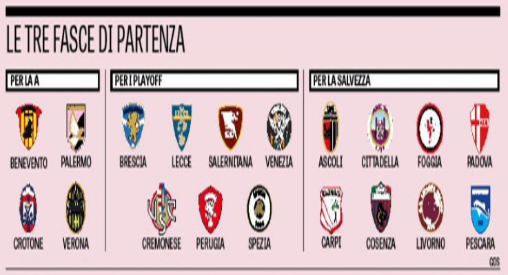 Questa sera al via il campionato di serie B con Brescia-Perugia. L’edizione odierna de “La Gazzetta dello Sport” analizza la partenza della serie cadetta, distribuendo le squadre partecipanti già in fasce. Per la serie A, secondo la rosea, il Palermo dovrà vedersela con le tre retrocesse dal massimo campionato la scorsa stagione. Subito dietro a rincorrere i posti validi per i play off, ci saranno Brescia, Lecce, Salernitana, Venezia, Cremonese, Perugia, Spezia. Infine a lottare per la salvezza saranno in otto: Ascoli, Cittadella, Foggia, Padova, Carpi, Cosenza, Livorno e Pescara. In alto la griglia di partenza in questione.