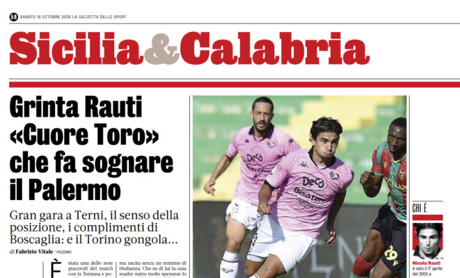L’edizione odierna della “Gazzetta dello Sport” si sofferma su Nicola Rauti, attaccante del Palermo.