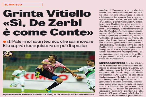 Gazzetta dello Sport: “Grinta Vitiello: «Sì, De Zerbi è come Conte. Il Palermo ha un tecnico che sa innovare. E io saprò riconquistare un po’ di spazio»”