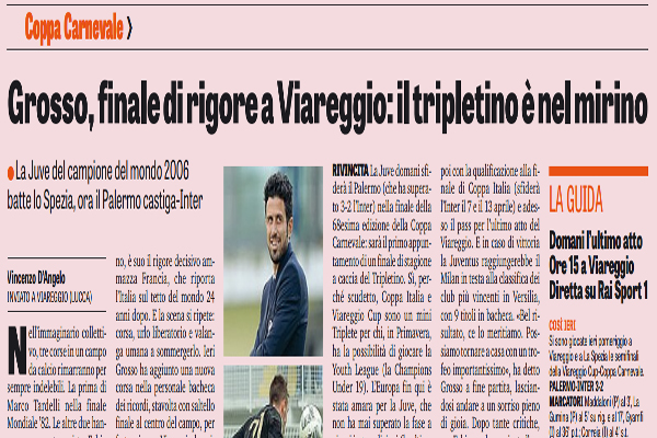 Gazzetta dello Sport: “Grosso, finale di rigore a Viareggio: il tripletino è nel mirino. La Juve batte lo Spezia, ora il Palermo castiga-Inter”