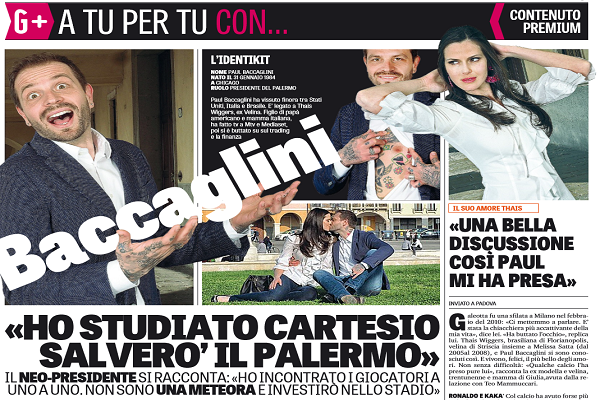 “«Li ho voluti incontrare uno per uno, partendo dall’allenatore Diego Lopez. E alla fine ho chiesto di darmi del tu. E ho detto loro che ce la possiamo ancora fare, che ci possiamo salvare». Seduto al caffè Box di Padova, città della mamma, in Prato della Valle, il neo presidente del Palermo Paul Baccaglini in perfetto italiano, ma con accento molto americano (il papà vive a Boston) parla a ruota libera, di sè, di Thais, del passato da Iena, della sua vita, prima spericolata e ora molto razionale. Che per un pelo non ha preso un’altra piega: «Volevo fare il giocatore di basket, ero un buon play. Amavo Jordan e Pozzecco. Ginocchio e caviglia mi hanno tradito». E si è buttato nello spettacolo… «Conobbi Claudio Cecchetto, poi è arrivata Rtl 102,5, quindi le Iene, quattro stagioni. Poi l’incontro con Pif, Mtv. E basta; ogni cosa ha il suo tempo. E’ stato bello finché c’è stata passione ed emozione, ma non avrei mai obliterato il cartellino per stare nel mondo dello spettacolo». E quindi? «Mi sono buttato nel trading. Avevo messo da parte un piccolo capitale. Ho studiato, viaggiato, mi sono messo al computer, ho fatto pure i corsi on line. Ore e ore sui mercati americani ed europei. La geometria mi è sempre piaciuta e apprezzavo Cartesio e la sua teoria del metodo». Fa pure il colto. E pensare che è noto per aver creato il partito del limone,la teoria del limonare (baciare) e per aver detto di essere «uno senza cervello». «Quella del cervello non la ricordo, quella del limone sì. Era un programma pensato da Endemol e imperniato sul gioco della bottiglia. E ci si baciava pure. Credo che il bacio sia uno dei momenti più belli e sinceri della nostra vita». Beato lei che bacia Thais. Ma la gente come fa a crederle se si presenta come presidente del Palermo? Ha idea di quanti dubbi ci sono sulla sua persona? «Eh sì, sono giovane, sto con la ex velina, che, però, ha una testa così… Facevo la Iena, ho più di 60 tatuaggi. Ma ad aprile sarò al 100% il proprietario del Palermo e sarà creata una società apposita. E in città starò tanto dalla prossima stagione quando avremo sistemato la nostra vita. E io Thais e sua figlia ci trasferiremo a Milano. Prenderò, comunque, casa a Mondello. Non sono una meteora e neppure, come dicono, uno che sta tre mesi fino alla retrocessione a fare da parafulmine e poi torna Zamparini. Voglio vivere squadra e città». Sì, ma tutti chiedono: ma questo Baccaglini quanto ha pagato il Palermo e, soprattutto, come l’ha comprato? «Ora spiego: con Zamparini mi ha messo inizialmente in contatto Frank Cascio. Poi ho conosciuto Angelo Baiguera (braccio destro di Zamparini). Maurizio voleva fare una riorganizzazione totale del suo patrimonio, all’interno del quale c’è pure il Palermo. Era stufo di insulti e pressioni. Stanco. Questa è una collaborazione tra me e lui. Che da ora faccio il presidente. Non si può dire che ho pagato il Palermo una determinata cifra perché gli investimenti verranno fatti quando ci sarà bisogno. Sicuramente per lo stadio che è il mio obiettivo principale e gli incontri istituzionali della settimana scorsa lo dimostrano. Lo stadio è la chiesa in cui si celebra la messa. E’ tutto. Quella con Zamparini è stata una trattativa condotta in Friuli, a casa sua e durata mesi, in silenzio. Come deve essere. Sono operazioni complesse e articolate. Io rappresento il fondo Integritas Capital, che funge da tramite per alcuni investitori, ma non è che devono essere svelati i nomi dei componenti. Si lavora in segreto con tanti studi legali. L’idea, ripeto, è riorganizzare la struttura di Zamparini e alla componente protagonismo non ho proprio pensato». D’accordo, ma la gente vuole capire, non si accontenta. «Zamparini non uscirà dalla mia vita. Ha fatto calcio per 40 anni, ingaggiato gente come Cavani, Pastore, Dybala, Vazquez, tanto per citare i più recenti. E io sono così scemo da privarmi di lui? Il mio compito è valorizzare il brand Palermo. Perché una cosa su questo aspetto mi permetto di dirla». La dica. «In Italia i club non valorizzano il brand. Ha idea delle potenzialità che ha il Palermo e Palermo? Porterò in estate la squadra a New York. Ma in pochi giorni ho già messo su un progetto che mi sta a cuore: negli uffici dello stadio ospiteremo, in collaborazione con l’Università, giovani studenti che progettano delle start up. Le migliori le faremo nostre». Baccaglini, prima di diventare presidente del Palermo, che rapporto aveva col calcio? «Sono stato una sola volta a San Siro a vedere l’Inter. Mi portò in curva un amico. Una volta in radio mi presentarono Zanetti. E ho ammirato Del Piero, mi sembra una persona per bene. Ho sempre guardato la Nazionale». La critica chiede un grande Palermo, in A o in B. Con Lopez? «Lopez mi piace, ha grinta, e la infonde ai giocatori. E’ uno di loro e lo rispettano. Io credo che Palermo debba stare in A, con tutto il rispetto per l’Empoli che abbiamo in casa all’ultima giornata. Spero tanto sia la sfida decisiva. I ragazzi li ho visti decisi a provarci. Poi penseremo a cosa fare. La base c’è e la società non è affatto messa male»”. Queste l’intervista integrale a Paul Baccaglini riportata oggi su “La Gazzetta dello Sport”.