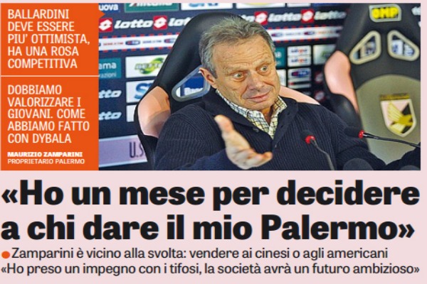 Gazzetta dello Sport: “«Ho un mese per decidere a chi dare il mio Palermo». Zamparini è vicino alla svolta: vendere ai cinesi o agli americani: «Ho preso un impegno con i tifosi, la società avrà un futuro ambizioso»