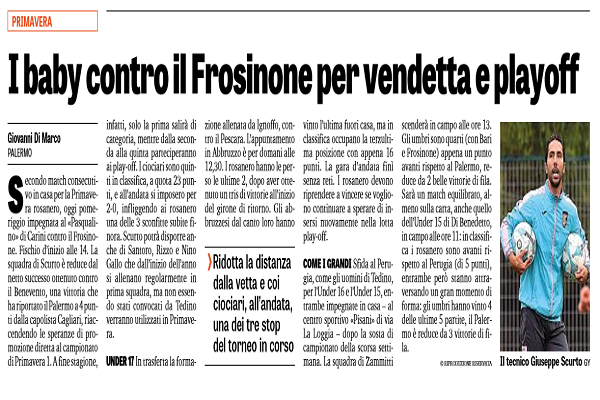 “Secondo match consecutivo in casa per la Primavera rosanero, oggi pomeriggio impegnata al «Pasqualino» di Carini contro il Frosinone. Fischio d’inizio alle 14. La squadra di Scurto è reduce dal netto successo ottenuto contro il Benevento, una vittoria che ha riportato il Palermo a 4 punti dalla capolista Cagliari, riaccendendo le speranze di promozione diretta al campionato di Primavera 1. A fine stagione, infatti, solo la prima salirà di categoria, mentre dalla seconda alla quinta parteciperanno ai playoff. I ciociari sono quinti in classifica, a quota 23 punti, e all’andata si imposero per 20, infliggendo ai rosanero una delle 3 sconfitte subite finora. Scurto potrà disporre anche di Santoro, Rizzo eNino Gallo che dall’inizio dell’anno si allenano regolarmente in prima squadra, ma non essendo stati convocati da Tedino verranno utilizzati in Primavera.[…]”. Questo quanto scritto dall’edizione odierna de “La Gazzetta dello Sport” in merito alla Primavera rosanero.