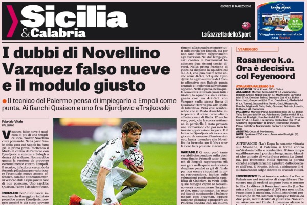 Gazzetta dello Sport: “I dubbi di Novellino: Vazquez falso nueve e il modulo giusto”