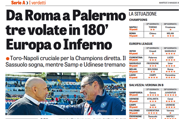 Gazzetta dello Sport: “I verdetti della serie A, da Roma a Palermo tre volate in 180’ Europa o Inferno. All’ultima c’è Udinese-Carpi: partita spareggio o «biscottata»?”