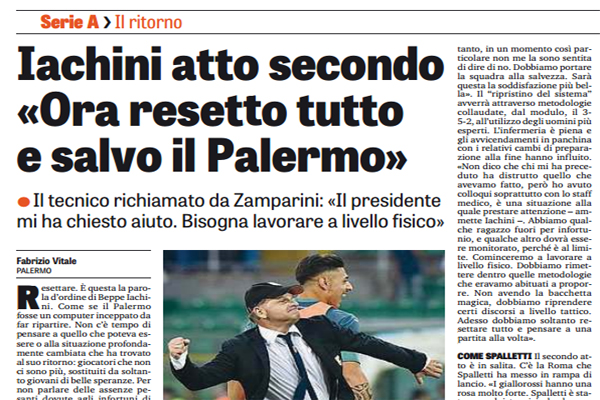 Gazzetta dello Sport: Iachini atto secondo «Ora resetto tutto e salvo il Palermo»