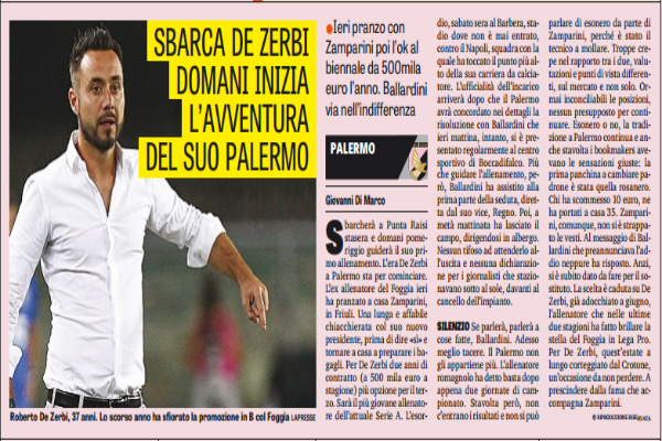 “Sbarcherà a Punta Raisi stasera e domani pomeriggio guiderà il suo primo allenamento. L’era De Zerbi a Palermo sta per cominciare. L’ex allenatore del Foggia ieri ha pranzato a casa Zamparini, in Friuli. Una lunga e affabile chiacchierata col suo nuovo presidente, prima di dire «sì» e tornare a casa a preparare i bagagli. Per De Zerbi due anni di contratto (a 500 mila euro a stagione) più opzione per il terzo. Sarà il più giovane allenatore dell’attuale Serie A. L’esordio, sabato sera al Barbera, stadio dove non è mai entrato, contro il Napoli, squadra con la quale ha toccato il punto più alto della sua carriera da calciatore. L’ufficialità dell’incarico arriverà dopo che il Palermo avrà concordato nei dettagli la risoluzione con Ballardini che ieri mattina, intanto, si è presentato regolarmente al centro sportivo di Boccadifalco. Più che guidare l’allenamento, però, Ballardini ha assistito alla prima parte della seduta, diretta dal suo vice, Regno. Poi, a metà mattinata ha lasciato il campo, dirigendosi in albergo. Nessun tifoso ad attenderlo all’uscita e nessuna dichiarazione per i giornalisti che stazionavano sotto al sole, davanti al cancello dell’impianto.