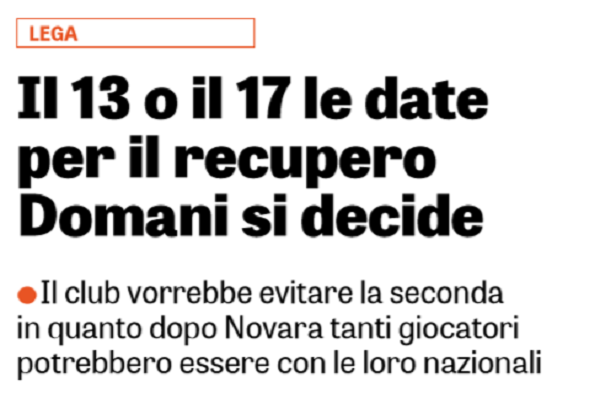Gazzetta dello Sport: “Il 13 o il 17 le date del recupero. Domani si decide”