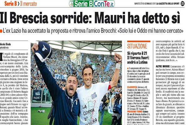 Gazzetta dello Sport: “Il Brescia sorride: Mauri ha detto sì. L’ex Lazio ha accettato la proposta e ritrova l’amico Brocchi: «Solo lui e Oddo mi hanno cercato»”