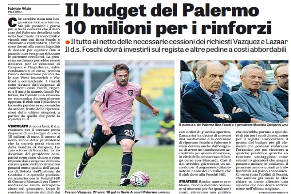 “Che sarebbe stata una lunga estate lo si era intuito. Ma più passano i giorni più si ha la certezza che il mercato del Palermo decollerà solo nella fase finale. Ci sono limiti e vincoli con cui Rino Foschi è chiamato a confrontarsi. I limiti sono dovuti alla scarsa liquidità di denaro per operare fino a quando non verranno sbloccate le partenze eccellenti. La prossima settimana potrebbe essere decisiva per la cessione di Vazquez e l’Inghilterra, salvo cambiamenti in corsa, sembra l’unica destinazione percorribile con West Bromwich e Watford a contenderslo. I vincoli sono dettati dall’esigenza di contenere i costi. Foschi, rispetto a 8 anni fa quando lasciò Palermo, ha trovato una situazione economica diametralmente opposta. Il club non è più ricco e ha molte pendenze economiche da sanare, frutto delle ripercussioni delle ultime stagioni, a partire da quella che portò la squadra in B. VINCOLATO A conti fatti, il d.s. rosanero per il mercato potrà disporre di un budget di circa 10 milioni di euro. E questo al netto anche delle plusvalenze che la società potrà ricavare dalla vendita di Vazquez, Lazaar e forse di Gonzalez. Le indicazioni del presidente Zamparini sono state chiare e sono imposte dalle esigenze di bilancio sul quale vertono situazioni pesanti come quella dell’acquisto di Dybala dall’Instituto de Cordoba e la querelle giudiziaria scaturita con la Penchil Hill di Gustavo Mascardi per l’intermediazione svolta nell’operazione col giocatore. Dopo le condanne ricevute dal club dai vari ordini di giustizia sportiva, Zamparini ha deciso di provare una mediazione e la decisione di riportare Foschi a Palermo è stata dettata anche dall’esigenza di avere un interlocutore accreditato per questa situazione, in virtù della conoscenza di lungo corso con Mascardi. Così il d.s. avrebbe già trovato un accordo per il pagamento dilazionato in 7 anni dei 15 milioni che il club deve alla Penchil Hill. STRATEGIE Risolto questo problema, l’uomo mercato rosanero si muoverà per far quadrare i conti, attraverso una politica che dovrebbe portare a spendere di più per i ruoli chiave, come per il regista. Concentrare il grosso del budget per gli elementi che possano rinforzare l’organico per poi ricorrere a qualche prestito e qualche situazione vantaggiosa come svincoli o giocatori che magari possono andare in scadenza il prossimo anno e quindi più abbordabili sul piano economico. Ci vorrà tutta l’abilità di Foschi, che sembra già avere le idee chiare su come allestire una squadra che non dovrà soffrire come nell’ultima stagione“. Questo quanto riportato dall’edizione odierna de “La Gazzetta dello Sport”.