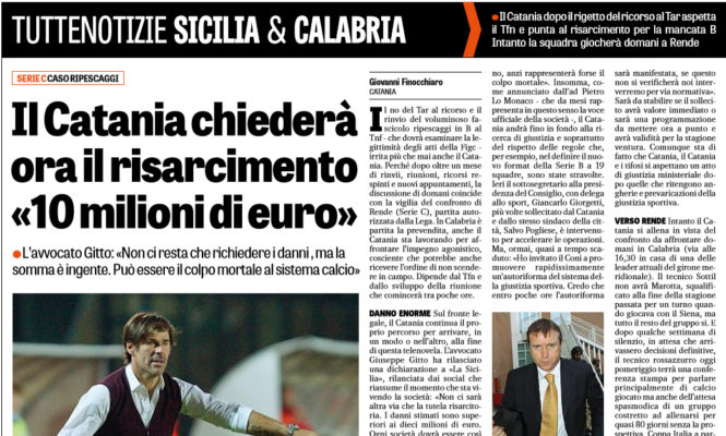 Gazzetta dello Sport: “Il Catania chiederà ora il risarcimento «10 milioni di euro»”