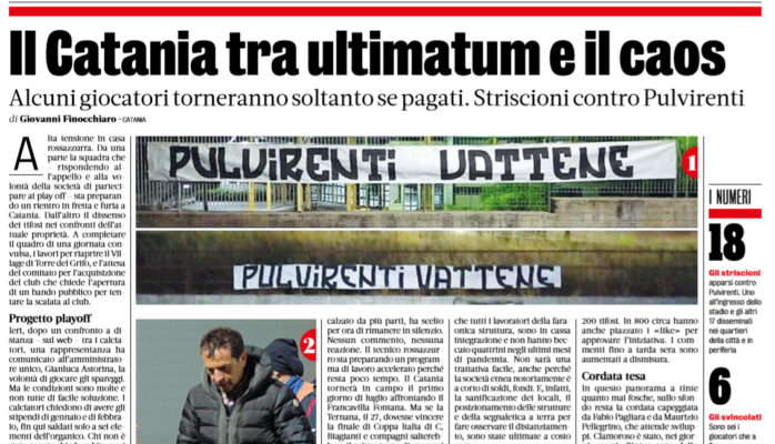 Gazzetta dello Sport: “Il Catania tra ultimatum e il caos. Alcuni giocatori ritorneranno soltanto se pagati. Striscioni contro Pulvirenti”