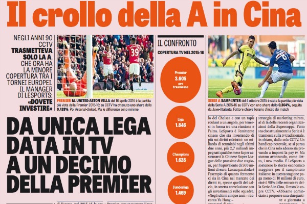 Gazzetta dello Sport: “Il crollo della A in Cina. Da unica Lega data in Tv a un decimo della Premier”