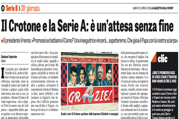 Gazzetta dello Sport: “Il Crotone e la Serie A: è un’attesa senza fine. Il presidente Vrenna: «Promossi se battiamo il Como? Una inseguitrice vincerà… aspetteremo. Che gioia il Papa con la nostra sciarpa»