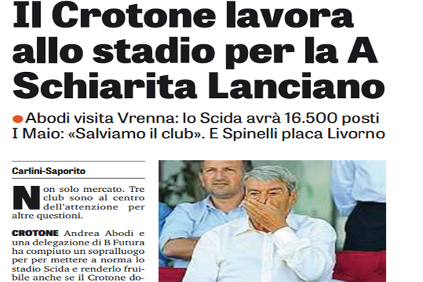 Gazzetta dello Sport: “Il Crotone lavora allo stadio per la A. Schiarita Lanciano. Spinelli placa il Livorno…”
