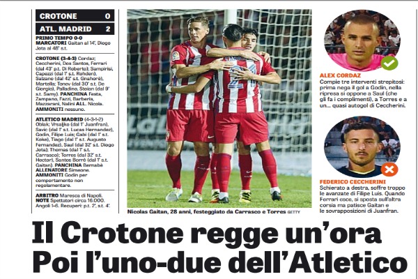 Gazzetta dello Sport: “Il Crotone regge un’ora. Poi l’uno-due dell’Atletico Madrid”