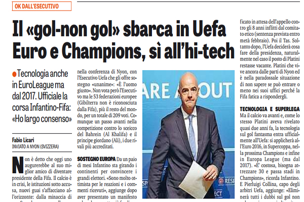 Gazzetta dello Sport: “Il ‘gol-non gol’ sbarca a Euro 2016 e in Champions, sì all’hi-tech”