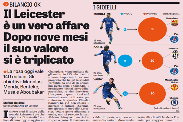 Gazzetta dello Sport: “Il Leicester è un vero affare. Dopo nove mesi il suo valore si è triplicato. La rosa oggi vale 140 milioni…”