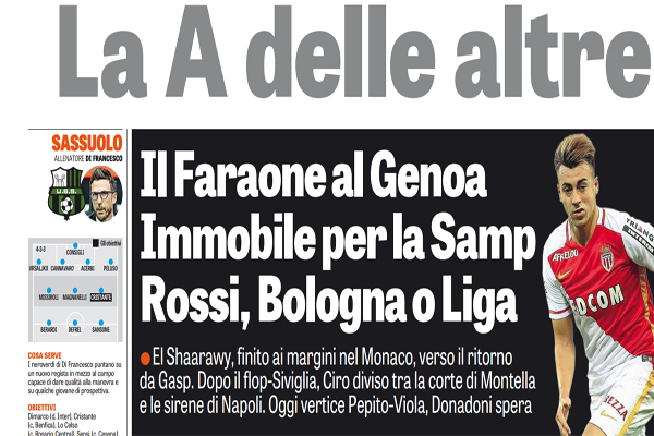 L’edizione odierna de “La Gazzetta dello Sport” fa il punto sul mercato delle squadre di serie A: “A volte ritornano. E hanno un obiettivo preciso: conquistare un posto al prossimo Europeo. Stephan El Shaarawy e Ciro Immobile, fratelli d’Italia che non hanno trovato fortuna all’estero, ritornano a casa per ritrovare gol e certezze. Montecarlo e Siviglia le prigioni dorate nelle quali non sono riusciti a imporsi. Inevitabile allora il dietrofront, per prendere la rincorsa verso la Francia. Antonio Conte aspetta entrambi speranzoso. IL RITORNO Dopo un avvio positivo El Shaarawy è scivolato in fondo alle gerarchie del tecnico Jardim. L’allenatore del Monaco in più di un’occasione ha dichiarato di non ritenere l’ex milanista fondamentale per il proprio progetto. Insomma, una chiara ammissione di come nel Principato cercassero di evitare il riscatto del classe ’92. Ad alimentare i contrasti, le 8 gare da subentrante e le 7 sostituzioni ricevute nelle prime 19 giornate di Ligue1. Nel Faraone è così cresciuta l’insofferenza e la voglia d’Italia. Le sirene della Serie A hanno iniziato a riecheggiare da metà dicembre. Il primo club a prendere informazioni è stato il Sassuolo: un sondaggio che non ha avuto ulteriori sviluppi nei giorni successivi. Più forte l’interessamento di Genoa e Bologna. In particolare, quello del presidente genoano Enrico Preziosi, da sempre un grande estimatore di El Shaarawy, sin dai tempi in cui il giovane Stephan divenne «Faraone» trascinando nel 2010 la Primavera allenata da Chiappino allo Scudetto di categoria. I colori rossoblù sono rimasti nel cuore di El Sha, così come quel Giampiero Gasperini che lo lanciò 16enne in Serie A in un Genoa-Chievo del 2008. Il feeling è ancora forte e proprio la presenza in panchina di Gasp è uno dei motivi che attira El Shaarawy verso il ritorno al Genoa. Con la benedizione del Milan, che detiene la proprietà del suo cartellino. ADIOS SPAGNA Se Atene piange, Sparta non ride: i 18 mesi da globetrotter per l’Europa non hanno sorriso a Ciro Immobile. Da capocannoniere della A col Torino era sbarcato a Dortmund nell’estate 2014 per rimpiazzare un certo Robert Lewandowski. Klopp, per portarlo in Bundesliga, aveva sborsato 20 milioni di euro. Appena 3 reti in 24 presenze in campionato e un inserimento complicato avevano convinto il goleador di Torre Annunziata a cambiare aria. Destinazione Spagna. Il Siviglia, fresco vincitore dell’Europa League, ha acquistato il centravanti in prestito con obbligo di riscatto per 12 milioni. Dopo pochi mesi, però, la sua avventura alla corte di Emery è già ai titoli di coda. Appena 255 minuti giocati nella Liga (seppure con il gol nella vittoria contro il Real Madrid) e troppe esclusioni sono alla base della nostalgia canaglia di Ciro verso il nostro calcio. La Samp ha acceso i radar, con il presidente Ferrero che, dopo Eto’o e Cassano, sogna un altro colpo. Sullo sfondo anche il Napoli, che pensa a Immobile come vice Higuain nel caso di partenza di Manolo Gabbiadini, un altro degli attaccanti che punta all’Europeo. Le pretendenti per lui non mancano (Fiorentina e Inter in primis), De Laurentiis però lo valuta 20 milioni di euro. Con l’idea di giocare da titolare per avere più chance in chiave azzurra, Manolo potrebbe liberare il posto per Immobile nel domino degli attaccanti. CASO PEPITO Solo gli infortuni hanno cancellato dai radar di Coverciano un talento come Giuseppe Rossi. Pepito vorrebbe rimanere a Firenze e aver garantita una continuità di impiego. La Fiorentina invece lo lascerebbe partire volentieri, ma senza dover contribuire al pagamento dello stipendio. Diversi club si sono fatti avanti, purché si tratti di un affare low cost. Per uscire dall’intreccio, è fissato per le prossime ore a Firenze un nuovo appuntamento tra l’entourage di Rossi e i dirigenti viola. Magari una via d’uscita per Pepito si troverà, perché per tutti è la soluzione più conveniente. La Fiorentina non vuol partecipare all’ingaggio, che resta pesante (un milione e mezzo) nonostante il recente sacrificio di Rossi. Il club punterebbe anzi a ottenere un indennizzo per il prestito o a legare la cessione a un eventuale, cospicuo diritto di riscatto. L’altra parte, cioè Pepito e staff, spinge perché la Fiorentina aiuti nella ricerca di una soluzione e che l’aiuto si traduca in un bonifico per lo stipendio del giocatore. Dalla Spagna si sono mosse Betis e Malaga, ma non hanno casse così ricche. In A piace tanto al Bologna, che dopo aver rigenerato negli anni Novanta Roberto Baggio e Beppe Signori potrebbe completare il tris di «resurrezioni»”