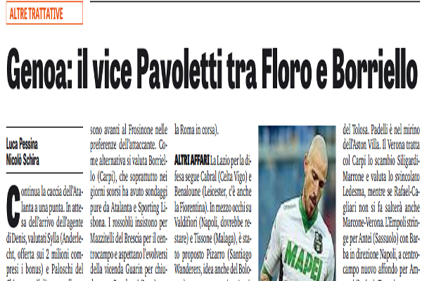 Gazzetta dello sport: “Il mercato di A – Genoa, il vice Pavoletti tra Floro e Borriello. Sampdoria scatenata” – Tutte le trattative di giornata