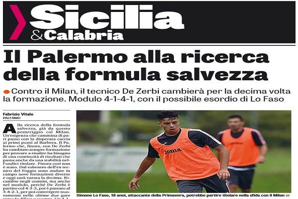 Gazzetta dello Sport: “Il Palermo alla ricerca della formula salvezza. Contro il Milan 4-1-4-1 e possibile esordio di Lo Faso”