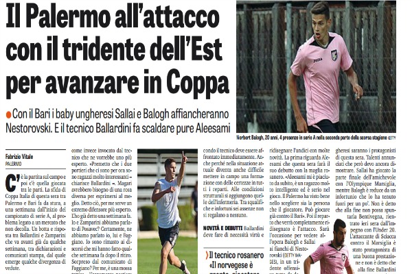 NOVITÀ E DEBUTTI Ballardini deve fare di necessità virtù e ridisegnare l’undici con molte novità. La prima riguarda Aleesami che questa sera farà il suo debutto con la maglia rosanero. «Aleesami mi è piaciuto da subito, è un ragazzo molto intelligente ed è serio nel gioco. Il Palermo ha visto bene nello scegliere sia la persona che il giocatore. Può giocare già contro il Bari». Poi il reparto che verrà completamente ridisegnato è l’attacco. Sarà l’occasione per vedere all’opera Balogh e Sallai ai fianchi di Nestorovski, in un tridente offensivo tutto da decifrare . L e indicazioni della vigilia dicono che i due baby ungheresi saranno i protagonisti di questa sera. Talenti annunciati che però devo ancora dimostrare. Sallai ha giocato la parte finale dell’amichevole con l’Olympique Marsiglia, mentre Balogh è reduce da un infortunio che lo ha tenuto fuori per un po’. Non è detto che alla fine non possa spuntarla Bentivegna, rientrato ieri sera dall’impegno con l’Under 20. L’attaccante di Sciacca contro il Marsiglia è stato protagonista di una buona prestazione e non è detto che alla fine Ballardini non possa riconfermarlo questa volta dall’inizio“. Questo quanto si legge nell’edizione odierna de “La Gazzettadello Sport”.