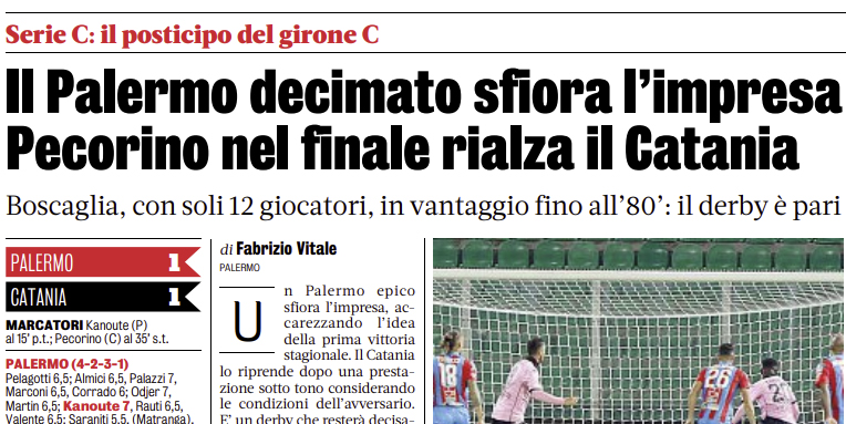 Gazzetta dello Sport: “Il Palermo decimato sfiora l’impresa. Pecorino nel finale rialza il Catania”