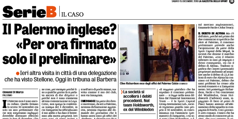 Il club di viale del Fante non è ancora stato ceduto. Lo scorso 30 novembre, data in cui le due parti si sono incontrate davanti ad un notaio per apporre le famose firme, è stato il giorno in cui in realtà è stato firmato soltanto un contratto preliminare. A renderlo noto è la Financial Innovations, che ieri pomeriggio ha divulgato un comunicato stampa attraverso il sito ufficiale del Palermo. Di seguito un estratto dell’odierna edizione de “La Gazzetta dello Sport”:  “[…] Che qualcosa non quadrava si era capito da tempo. La confessione degli inglesi ora spiega alcune cose, per esempio perché fino a qualche giorno fa si parlava ancora di due diligence o perché non è stata trasmessa alcuna comunicazione in Lega. Certo, non spiega la conferenza stampa del 4 dicembre, in cui Zamparini ha ufficializzato il suo addio e ha dato il benvenuto alla nuova proprietà. Ieri sono stati glis tessi inglesi a cercare di rendere meno oscura e misteriosa la vicenda, attraverso due comunicati emessi nell’arco di pochi minuti, stavolta tramite il sito del club, non via Instagram. […] IL DEBITO DI ALYSSA Ma c’è dell’altro, perché nel primo dei due comunicati si specifica che oltre al Palermo, il contratto preliminare prevede anche l’acquisizione da parte della Sport Capital della Mepal, la società che detiene il marchio del Palermo, «con il relativo subentro in tutti gli impegni e diritti conseguenti, tra cui il debito di Alyssa». Tradotto significa che i nuovi (potenziali) proprietari andranno ad acquisire anche il debito di 22,8 milioni di euro che Alyssa ha contratto col Palermo, debito che tanti problemi ha creato alla società rosanero e a Zamparini stesso. Ieri pomeriggio Richardson, Facile e l’ex centravanti del Wimbledon, Dean Holdsworth (l’advisory team, ingaggiato di fatto al posto di Platt) hanno assistito all’allenamento della squadra in compagnia di Foschi. Con i giocatori zero contatti. L’unico che ha avuto modo di conoscere gli inglesi, che oggi saranno in tribuna per la sfida con il Livorno, è stato Stellone”.
