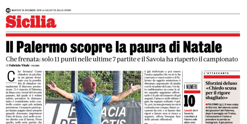L’edizione odierna della “Gazzetta dello Sport” parla di “frenata” del Palermo, che ha chiuso in picchiata un girone dominato fin qui. I rosanero – si legge – hanno pagato dazio proprio nel momento in cui doveva esserci un atto di forza: la sfida contro il Savoia. Poi ko contro l’Acireale, sempre in casa, e ancora un pareggio contro il Troina. Undici punti in sette partite, considerate le prime giornata di campionato, è un dato che stride. Dalla sfida contro il Palermo, il Savoia ha totalizzato 21 punti che hanno permesso di accorciare il gap dai rosanero da tredici a tre punti.