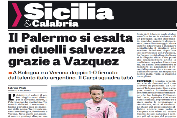 Gazzetta dello Sport: “Il Palermo si esalta nei duelli salvezza grazie a Vazquez”