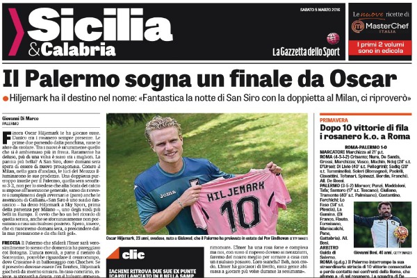 Gazzetta dello Sport: “Il Palermo sogna un finale da Oscar. Hiljemark: «Fantastica la notte di San Siro con la doppietta al Milan, ci riproverò»”