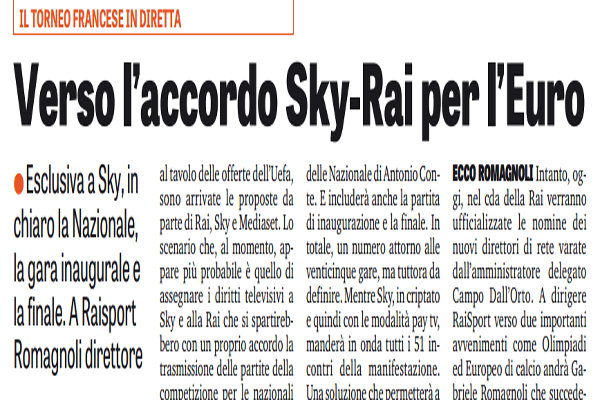 Gazzetta dello Sport: “Il torneo francese in diretta. Si va verso l’accordo Sky-Rai per l’Europeo – i dettagli”