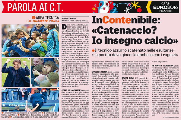 “Dove stavi andando, Antonio? Cosa cercavi per arrampicarti fin lassù, in cima alla panchina? Al gol di Pellè il c.t. si era fatto calciatore: non per scavalcare un cartellone a bordo campo ma il tetto della sua «casa», dopo essere stato sempre sull’uscio. Senza mai sedersi, senza mai fermarsi. Con la pioggia: impermeabile e cappellino, mentre Del Bosque se ne stava seduto ad aspettare il suo kway rosso. Con il sole: corde vocali torturate e la giacca strapazzata in quel perpetuo schizzare qua e là. Un animale da campo, «così mi hanno definito i miei calciatori ed è il motivo per cui anche in una serata così non sono pentito della scelta che ho fatto per il dopo Europeo. Io mi affeziono tanto al posto dove lavoro e a quelli con cui lo faccio, ma arriva un momento in cui ti rendi conto se ti permettono di fare quello che vuoi. L’Italia mi resta nel cuore e mi auguro un giorno di tornare: le emozioni che dà questa panchina non le dà nessuna partita». COME UN JOYSTICK Dove andavi, Antonio? Su e giù, sinistra e destra, avanti e indietro. Un aratro dell’area tecnica: «La partita devo giocarla anch’io: un giorno il preparatore atletico mi ha proposto di mettere un gps per misurare quanti chilometri faccio e a che intensità». Il joystick di una squadra trasformata in playstation: teleguidata da fuori dopo esserle entrato dentro. «Per fare le imprese il primo a crederci deve essere l’allenatore, e poi lavorare è un verbo che non tradisce mai: noi lavoriamo da un mese per stupire, stasera un po’ ci siamo riusciti». MOGLIE E FIGLIA Cosa cercava Antonio, aggrappato alla panchina? Sua moglie e sua figlia, e subito dopo i suoi giocatori: abbracciati tutti, uno per uno, prima di spingerli verso i tifosi «che ora spero siano orgogliosi di loro: è la cosa che mi interessa di più, anche più del risultato». Una notte per fare giustizia più di vent’anni dopo l’ultima eliminazione della Spagna in un Europeo o un Mondiale. Era il ’94, negli Usa, e in campo c’era ancora lui: «Ogni tanto tocca anche a noi gioire. Questa era una partita senza domani: per loro non c’è, per noi sì». C’è perché «sapevo che questa squadra ha dentro qualcosa di importante. E l’avevo detto prima, non dopo: dirlo dopo è troppo facile». C’è perché «ho cercato di fare una battaglia per far capire certe cose: l’unica strada era provare a essere un club e non una selezione, non abbiamo abbastanza talenti per potercelo permettere. Oggi siamo una squadra, in questo Europeo lo siamo sempre stati». BRAVO XAVI C’è perché ieri l’Italia ha avuto anche lo stesso possesso palla della Spagna a fine primo tempo, per esempio e non è proprio una cosa da tutti i giorni: «Abbiamo dimostrato che il nostro calcio non è solo catenaccio, ma chi mi conosce sa che io insegno a giocare a calcio, non a difendermi. Xavi ha detto che siamo un po’ Atletico Madrid e un po’ Barcellona: è la conferma che chi gioca a calcio capisce le cose, e cosa c’è dietro le cose». C’è perché «questa vittoria può essere importante anche per la nostra autostima, anche in vista delle qualificazioni mondiali. Ma se aumenta l’autostima non deve venir meno la sete di stupire e di far parlare». DE ROSSI E CANDREVA Stupire: il verbo perfetto per chi deve affrontare la Germania. «La squadra più forte dell’Europeo. E se qualcuno l’avesse dimenticato, veniamo da una sconfitta per 41 (amichevole di marzo) che aveva fatto scendere la fiducia molto in basso. Se quella di oggi è stata un’impresa, sabato sarà un’impresa titanica. Lo straordinario non basterà: servirà il superstraordinario, trovare ancora qualcosa di più dentro di noi. Con un giorno di riposo in meno e delle assenze da affrontare». Il recupero di Candreva è difficile, quello di De Rossi «da valutare: ma giocherà solo se recuperato al 120% e visto che mancherà pure Thiago Motta, nel frattempo dovrò trovare anche altre soluzioni, adattate». E’ il suo destino, e non da ieri”. Questo quanto si legge sull’edizione odierna de “La Gazzetta dello Sport”.