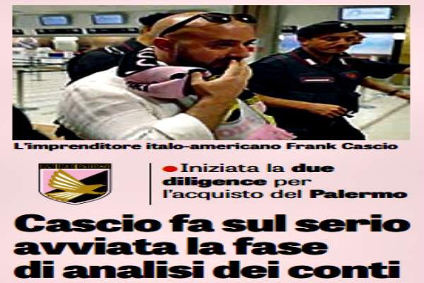“Tra Frank Cascio e il Palermo la trattativa entra nel vivo. Ieri, infatti, è partita la due diligence per far decollare l’operazione per l’acquisizione del club. Un passaggio obbligato nel quale, da entrambe la parti, vengono approfonditi i controlli su conti, risorse finanziarie e valutazione dei rischi. Dopo due incontri con il presidente Zamparini, lo sbarco a Palermo e la visita del terreno di Carini dove nei progetti del patron dovrebbe nascere il centro sportivo, l’imprenditore americano si è spostato a trascorrere qualche giorno di vacanza nei pressi di Castelbuono, il paese vicino al capoluogo siciliano di cui la sua famiglia è originaria. Cascio, comunque, non ha voluto perdere tempo e ha avviato la prima fase della trattiva attraverso la due diligence, appunto, anche per colmare il gap temporale con la cordata cinese intenzionata ad acquisire la società ed entrata in contatto con Zamparini prima di lui. L’italoamericano, invece, vuole arrivare preparato al 15 settembre, termine indicato dal presidente per la presentazione ufficiale dell’offerta sia ai cinesi che a Cascio. L’imprenditore statunitense è intenzionato a fare sul serio per convincere Zamparini a vendergli il Palermo”. Questo quanto si legge sull’edizione odierna de “La Gazzetta dello Sport”.