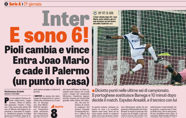 Gazzetta dello Sport: “Inter: e sono 6! Pioli cambia e vince. Entra Joao Mario e batte un coraggioso Palermo”