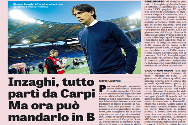 “Piacenza­ Carpi, neanche cento chilometri. Simone Inzaghi, neanche 19 anni. Le distanze per fare il pendolare erano abbordabili. Toccava a turno a papà Giancarlo e mamma Marina imbarcarsi e accompagnare il figlio piccolo al Cabassi, fino alla patente. Il Piacenza lo aveva mandato in prestito, per Inzaghino fu la prima esperienza tra i professionisti, in C1: mai si sarebbe immaginato di ritrovarsi il Carpi in Serie A, ancor meno di poterlo mandare in B con una vittoria della Lazio. «Aveva come punto di riferimento suo fratello Filippo». Chi parla è l’allenatore di Simone al Carpi, Gianni De Biasi, che ora guida l’Albania e come portiere all’Europeo avrà Berisha, che con Inzaghi fa panchina. GIALLOROSSO «Il fratello piccolo di Inzaghi regala alla Roma la vittoria». Gazzetta del 17 febbraio 1995, pagina 12, quella del Torneo di Viareggio. Si chiamava Coppa Carnevale, ma il regolamento ha sempre previsto i prestiti: la Roma avrebbe potuto schierare Totti ma era già in prima squadra, così per rinforzarsi e provare un giocatore guardò alla Serie C1. E a un giovanotto del Carpi. Strana la vita: se la Roma avesse deciso di prenderlo dopo quel Viareggio, Inzaghino non sarebbe mai diventato il miglior marcatore della storia della Lazio nelle competizioni Uefa, e oggi non ne sarebbe certo l’allenatore. Roma­Bayer Leverkusen, per la cronaca, finì 1­0, Inzaghi segnò al minuto 76, come il suo anno di nascita: pallonetto sul portiere tedesco, che non gli bastò per meritarsi un’altra occasione. VADO O NON VADO? «Era alla prima esperienza lontano da casa – ricorda De Biasi –. Un giocatore di buona qualità, ma ancora acerbo per il calcio dei grandi. Quell’anno, però, gli servì da esperienza. Come gli servì qualche calcio nel sedere…», Simone il campo lo vide poco: nove presenze in C1, nessun gol. Quelli, li segnò nei tre anni successivi, tra C2 e C1, Novara, Lumezzane e Brescello. Mamma e papà, Carpi­Lazio la vedranno a casa: Marina al piano terra, Giancarlo al primo piano, a meno che un amico non riesca a convincerlo ad andare fino a Modena. «Deciderò all’ultimo – dice –. Ma magari Simone fa un salto a casa per salutarci». Difficile, viste le ore contate e visto quanto conta Carpi­Lazio anche per quello che ai tempi del Viareggio era solo «il fratello piccolo di Inzaghi», bandiera laziale ma romanista mancato”.
