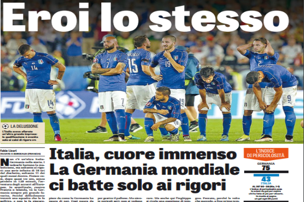 Gazzetta dello Sport: “Italia, cuore immenso. La Germania mondiale ci batte solo ai rigori”